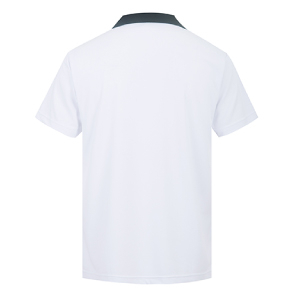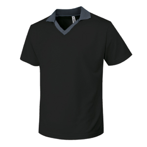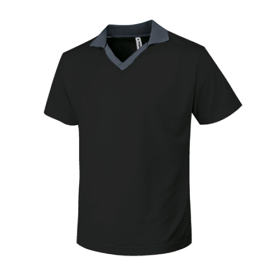 襟元の配色がアクセントになった、コントラストVネックタイプのゲームシャツ。