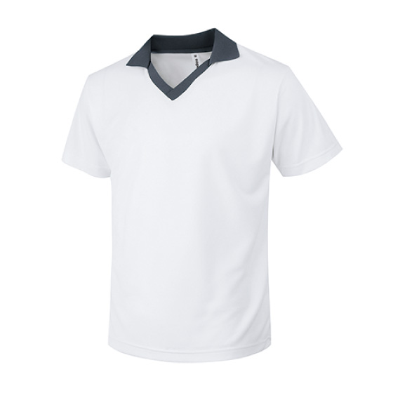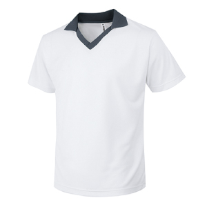 襟元の配色がアクセントになった、コントラストVネックタイプのゲームシャツ。